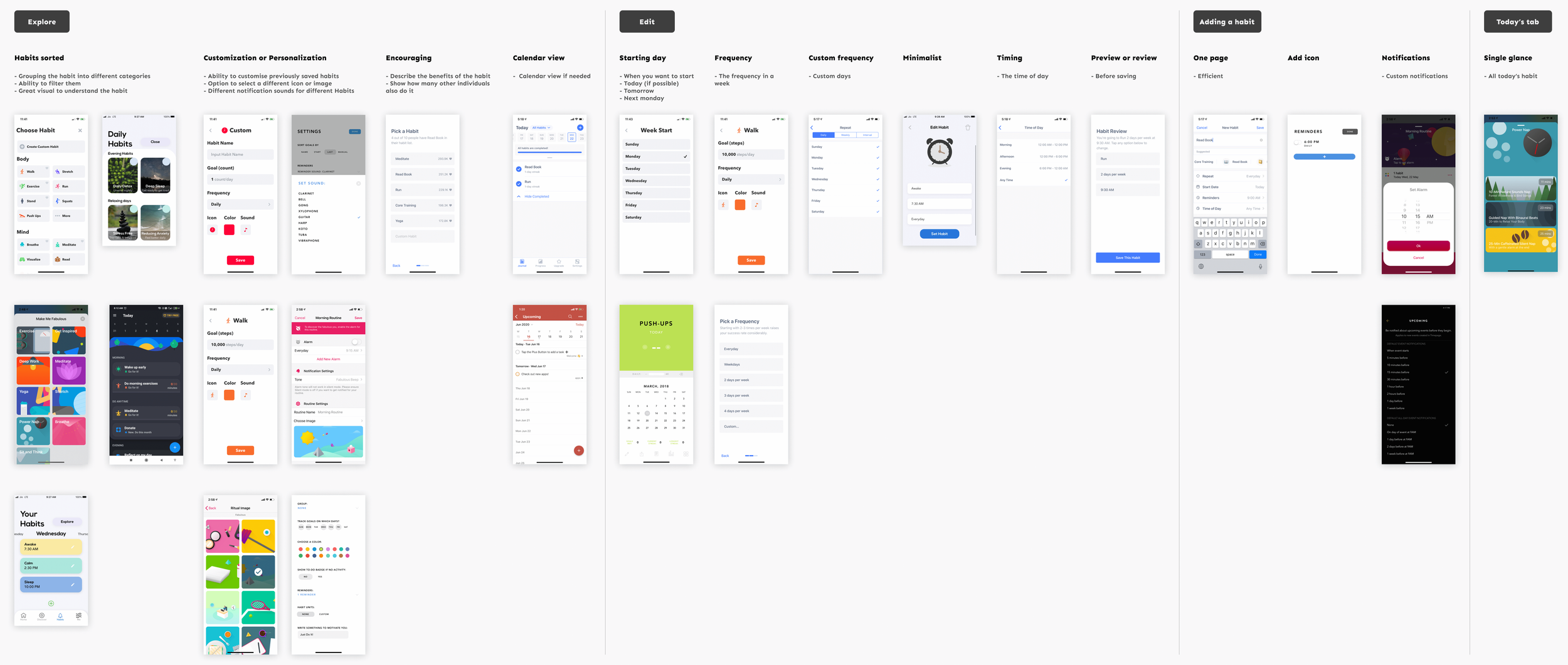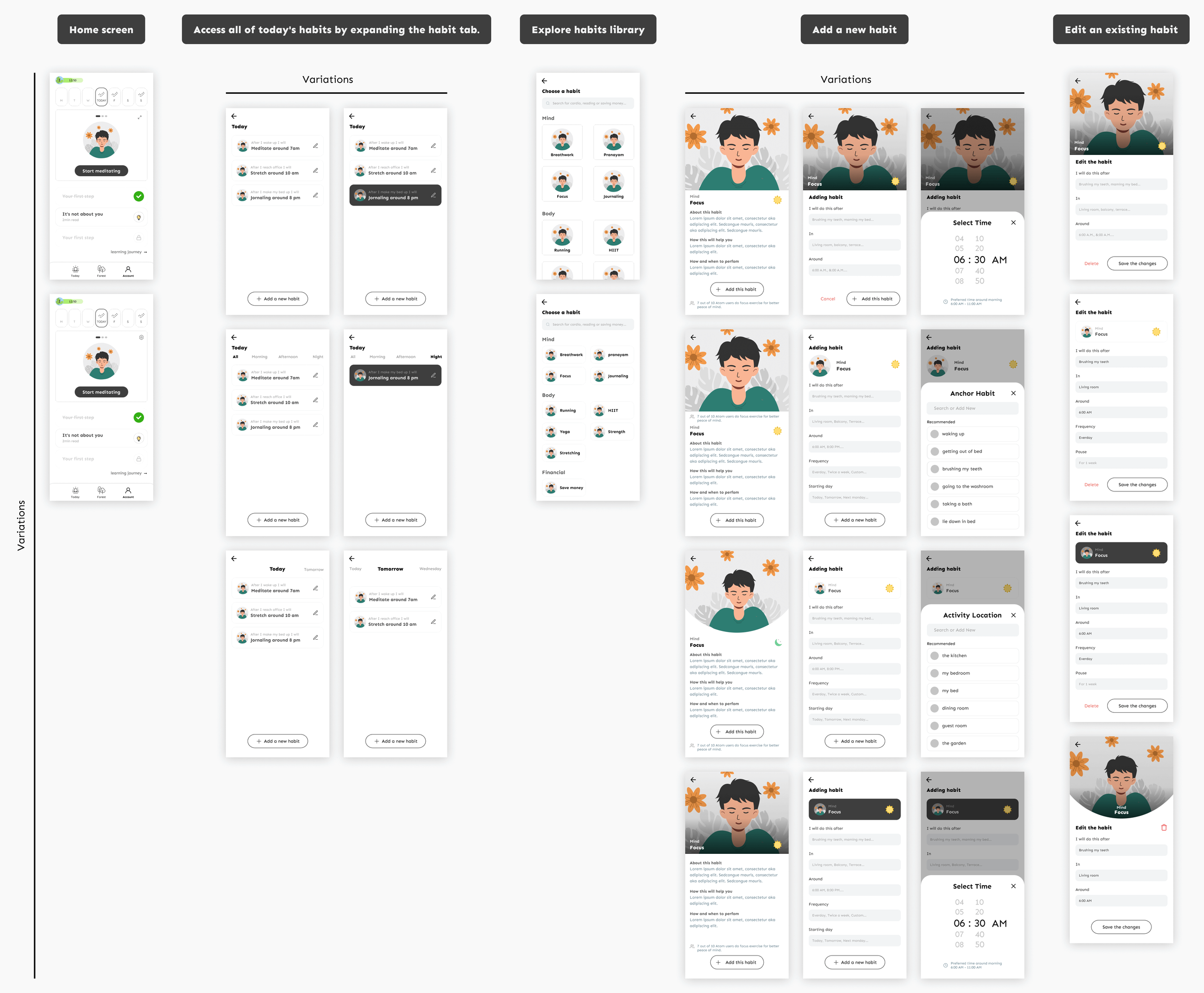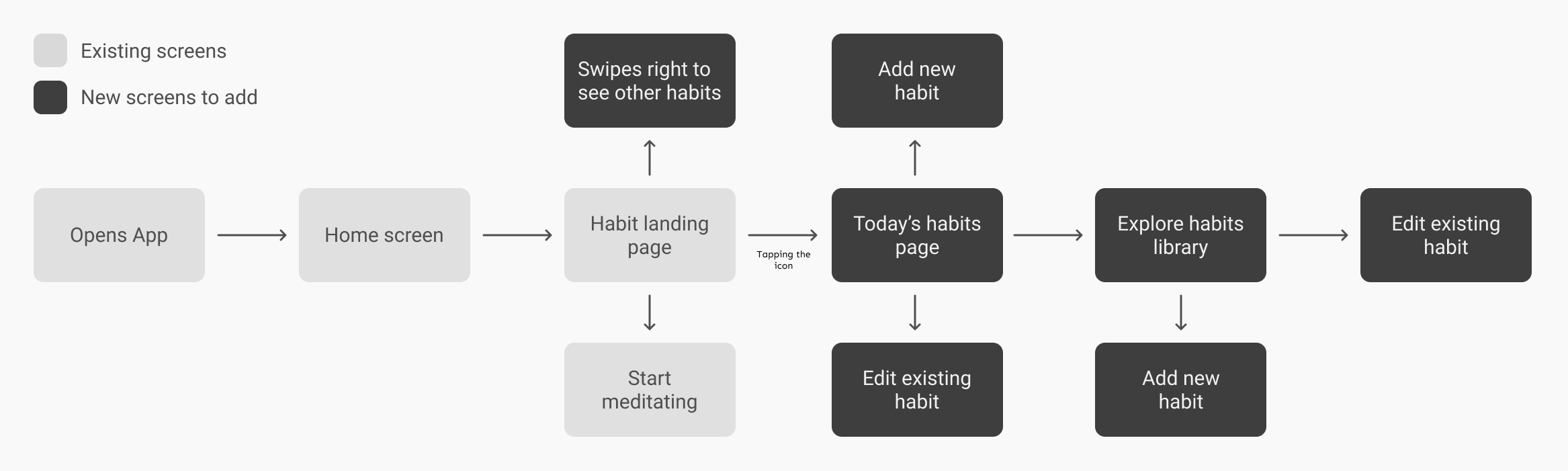 I began by determining how many habits I needed to incorporate into our existing experience. Then I explored where I could fit these without altering our existing user flow.